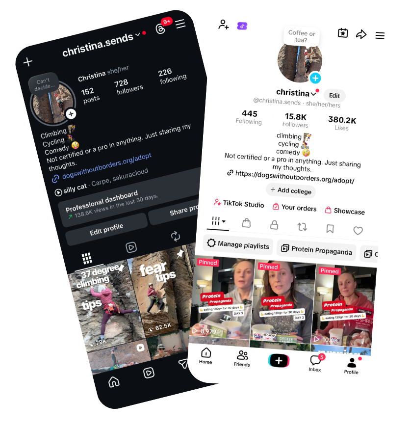 I’ve build a small following on TikTok and am now expanding to Instagram, creating humorous and self deprecating content about rock climbing, cycling, and building healthy habits to support my hobbies. With my combined accounts, I have over 16k followers and 1M views.