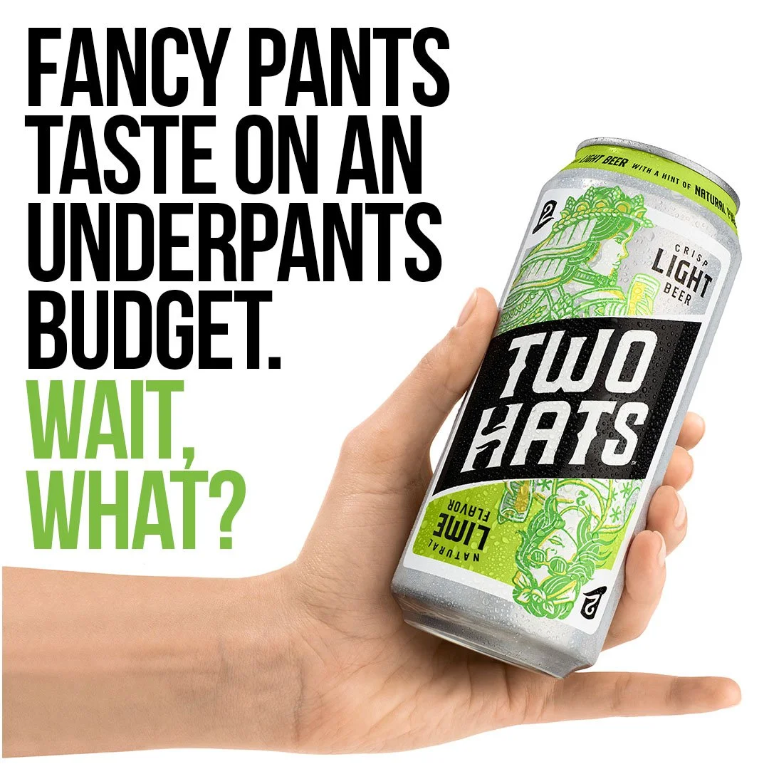 Our marketing research also revealed that this audience was very surprised by how cheap Two Hats was—6 tall boys for around $5. The beer also had two subtle flavor options of pineapple and lime, setting it apart from its competition.